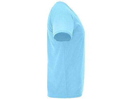 Спортивная футболка с коротким рукавом реглан. Круглый вырез горловины с отделкой плоским швом. Рукав сложного кроя для обеспечения дополнительного удобства при занятиях спортом. Отделка плоским швом с застилом по пройме и рукавам.