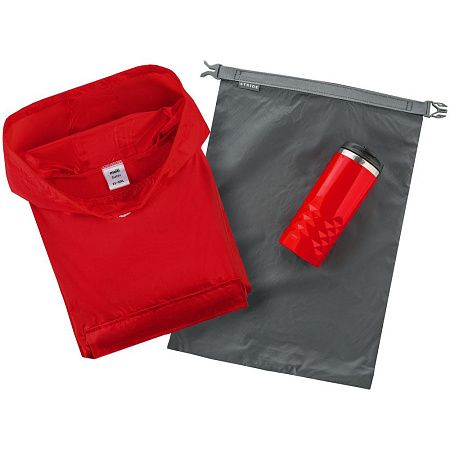 мешок - нейлон, рипстоп; термостакан - пластик, нержавеющая сталь; дождевик - полиэстер