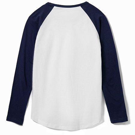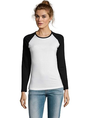 Женская двухцветная футболка с боковыми швами, длинным рукавом реглан и закругленным низом.