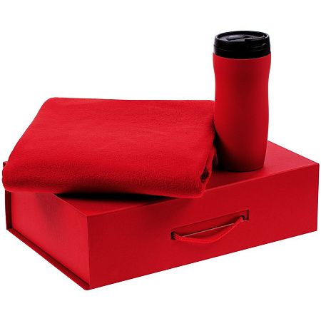 термостакан - пластик, крышка, внутренняя колба; нержавеющая сталь, корпус; покрытие софт-тач; плед - флис, плотность 180 г/м²; коробка - переплетный картон; наполнитель - бумага