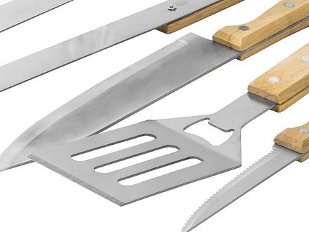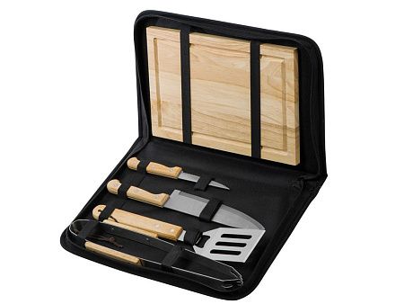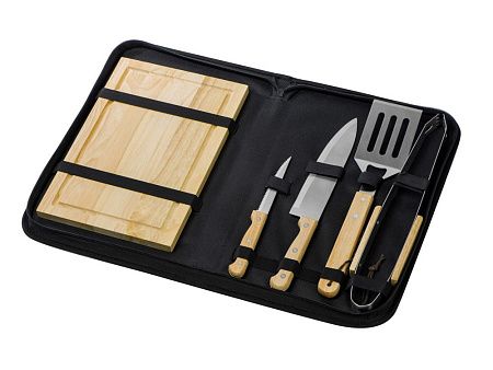 разделочная доска 20 х 30 см, щипцы 34,5 см, лопатка 32,5 см, нож для стейка 21,5 см, нож большой 31,5 см, чехол из полиэстера 38,5 х 4,5 х 24,8 см