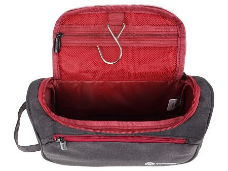 Несессер выполнен из чёрного полиэстера c внешней отделкой и внутренней тканью бордового цвета. В нём можно хранить или транспортировать личные вещи и гаджеты.