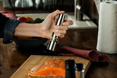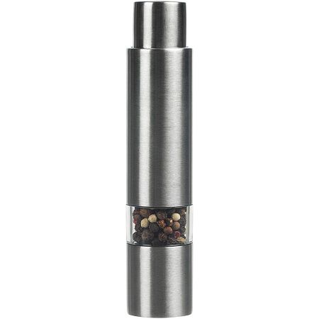 Компактная ручная мельница с пружинным механизмом и металлическими жерновами.