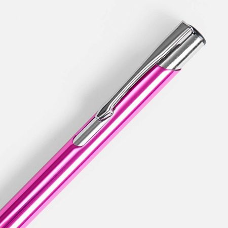 Яркая шариковая ручка с глянцевым цветным корпусом и хромированными деталями.