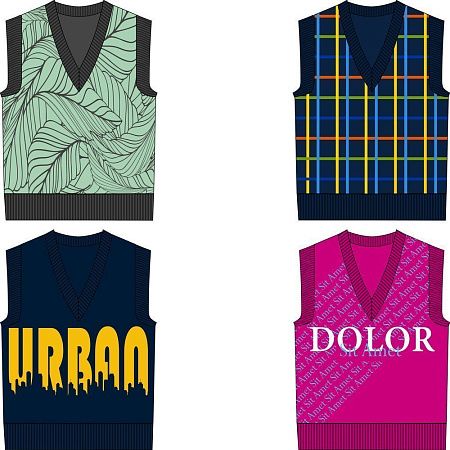Модель: жилет жаккардовой вязки, 2–3 цвета нитей, спущенное плечо, крупная петля. На бейках горловины и проймы возможна отделка в виде контрастных полос (не более 3-х цветов).