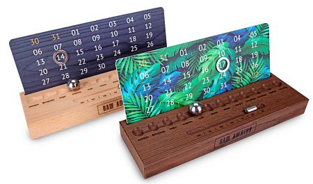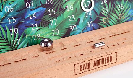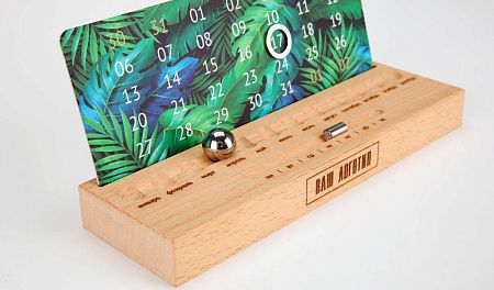 Деревянная подставка изготавливается из дерева светлого или темного цвета. Шариком выставляется месяц, горизонтальным бегунком день недели, а даты выставляются магнитным курсором. Большая площадь под ваш логотип, удобен в использовании, занимает мало места на столе. Календарный блок вы можете выбрать из готовых или заказать со своим индивидуальным дизайном.