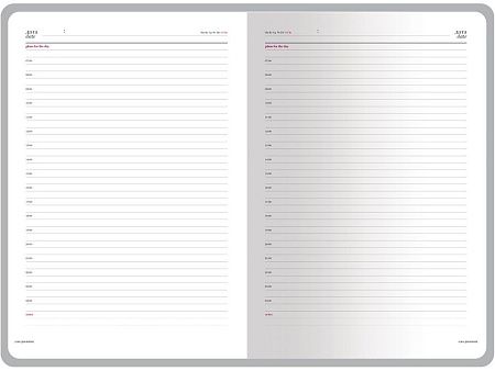 В ежедневнике «Sidney Nebraska» есть полезная справочная информация и телефонная книга на 18 листов, а также 272 страницы для записи идей, мыслей и составления рабочих планов. Специально для ежедневных офисных дел в ежедневнике используется качественная белая бумага плотностью 70 г/м². Разметка блока с указанием времени позволяет планировать дела с точностью до 1 часа.