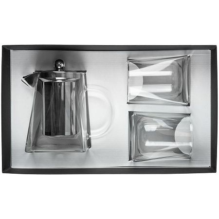 чайник, стаканы - боросиликатное стекло; крышка и сито - нержавеющая сталь; коробка - переплетный картон