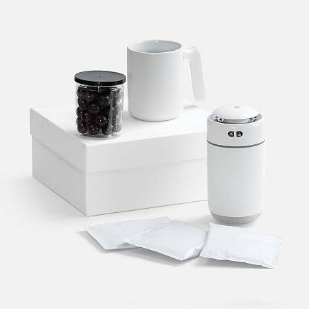 увлажнитель - пластик; кружка - каменная керамика; коробка - переплетный картон