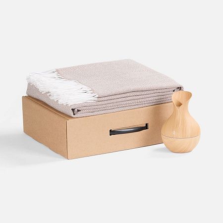 плед - шерсть, 15%; хлопок, 5%; полиэстер, 60%; акрил, 20%, плотность 200 г/м²; увлажнитель - пластик; коробка - картон