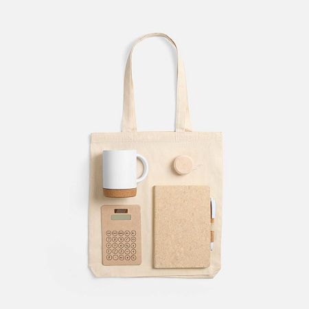 блокнот - пробка; кружка - каменная керамика, подставка - пробка; калькулятор - картон; сумка - хлопок 100%, плотность 210 г/м²; саржа; игрушка-антистресс - дерево; ручка - пластик, пробка