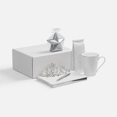 кружка - костяной фарфор; гирлянда - пластик, металл; свеча - парафин; ежедневник - искусственная кожа; ручка - металл