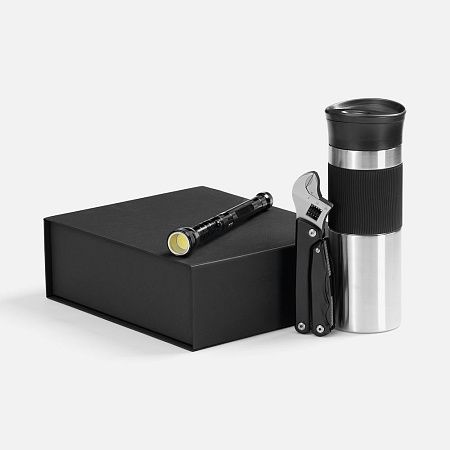 мультитул - нержавеющая сталь; алюминий; термостакан - нержавеющая сталь; фонарь - алюминий, металл; коробка - переплетный картон, бумага malmero