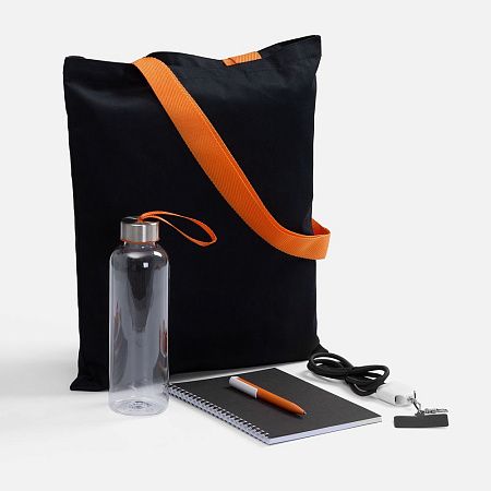 сумка - хлопок, 240 г/м²; ручки - полиэстер; кабель-ланьярд - нейлон, пластик; металл; бутылка - пластик, пищевой; крышка - металл, пластик; блокнот - бумага, картон; ручка - пластик