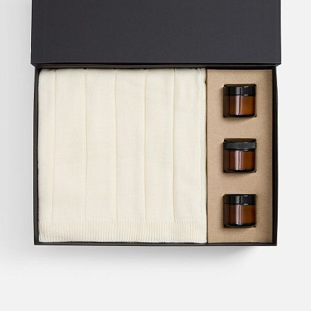 плед - акрил 100%, плотность 310 г/м² ; подсвечник - стекло, крышка - пластик; свеча - парафин, соевый воск, парфюмерная композиция; коробка - переплетный картон, бумага magic