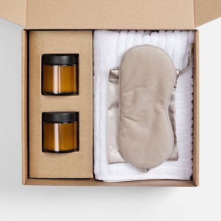 полотенце - хлопок 100%, плотность 540 г/м²; подсвечник - стекло, крышка - пластик; свеча - парафин, соевый воск, парфюмерная композиция; маска - полиэстер 100%, сатин; коробка - микрогофрокартон, Т-23Е