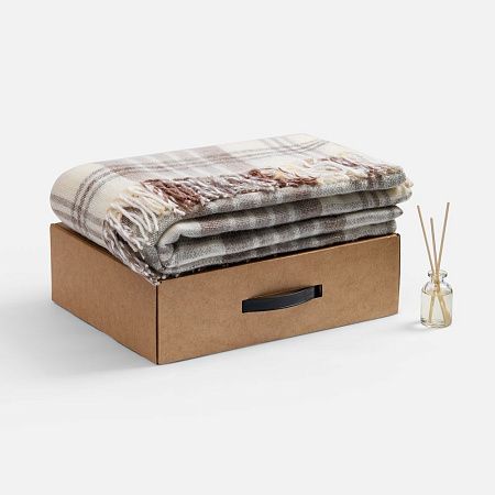 плед - шерсть 50%; полиэстер 30%; акрил 20%; флакон - стекло, палочки - дерево; коробка - микрогофрокартон