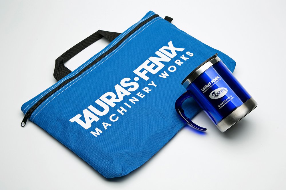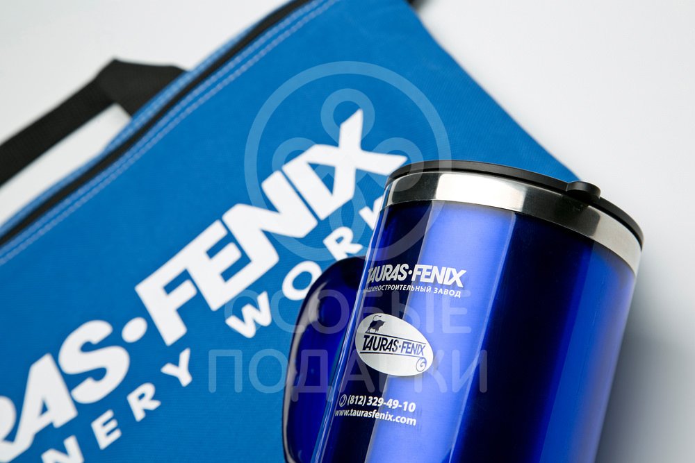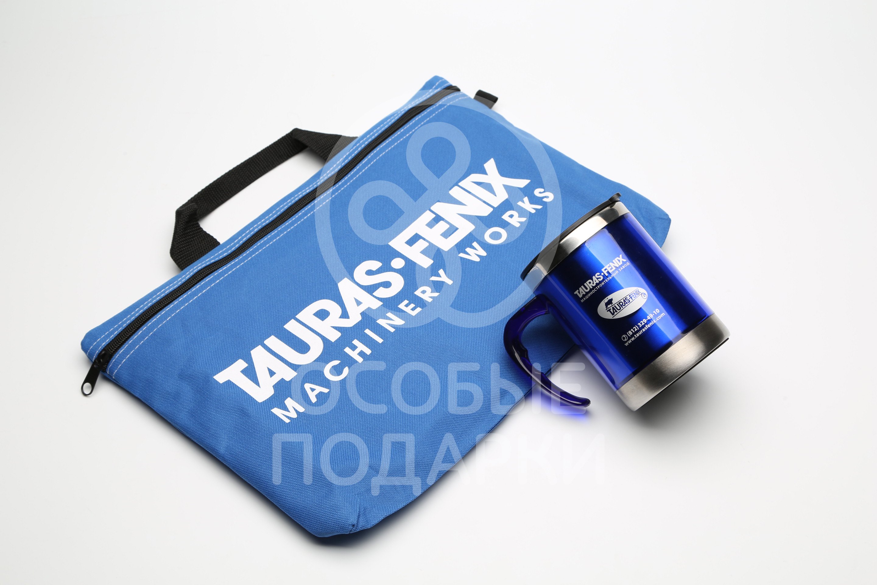 Компания "Особые Подарки" выполнила заказ для «ТАУРАС-ФЕНИКС» на ярко-синие промо-сувениры: конференц-сумку и практичную термокружку.