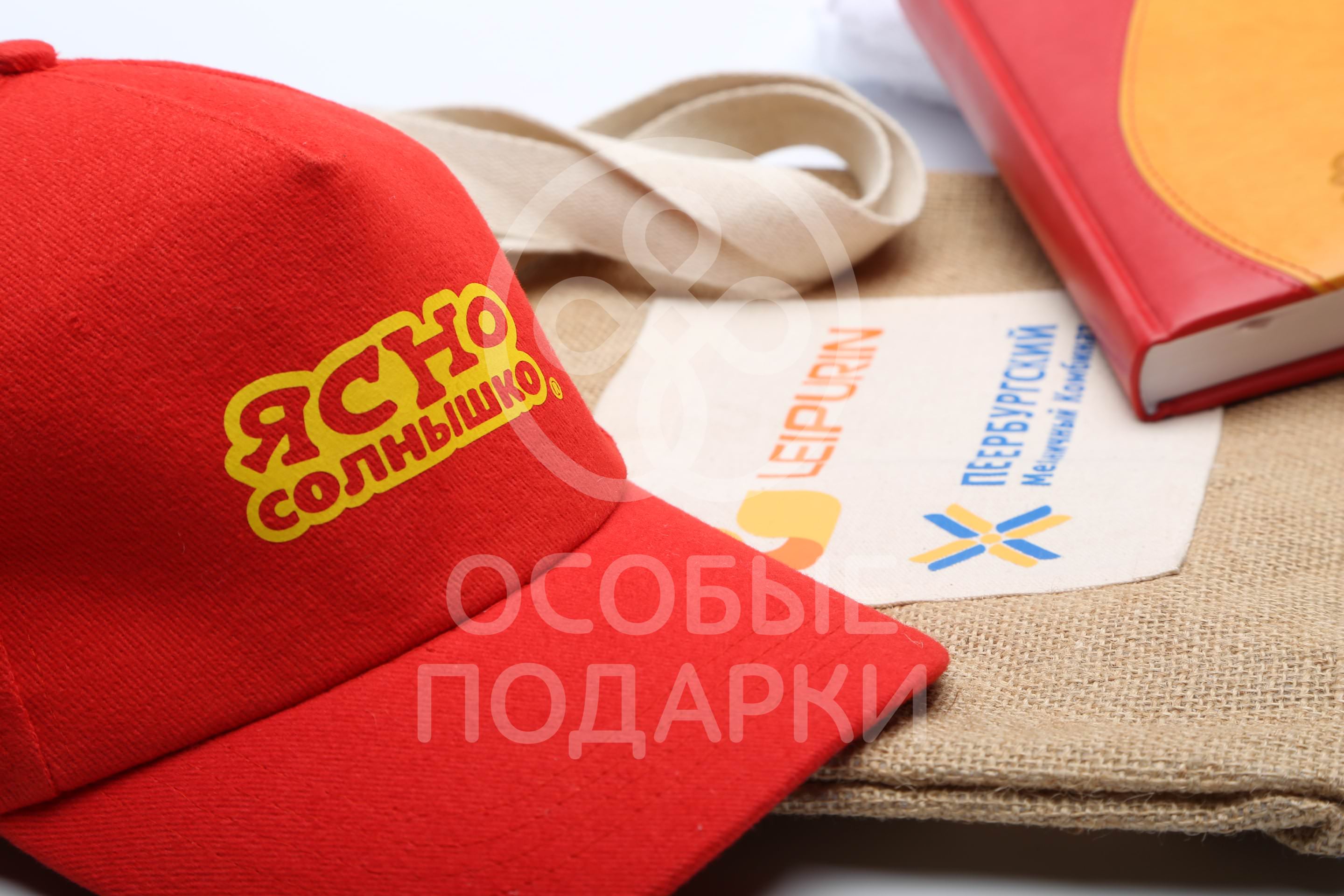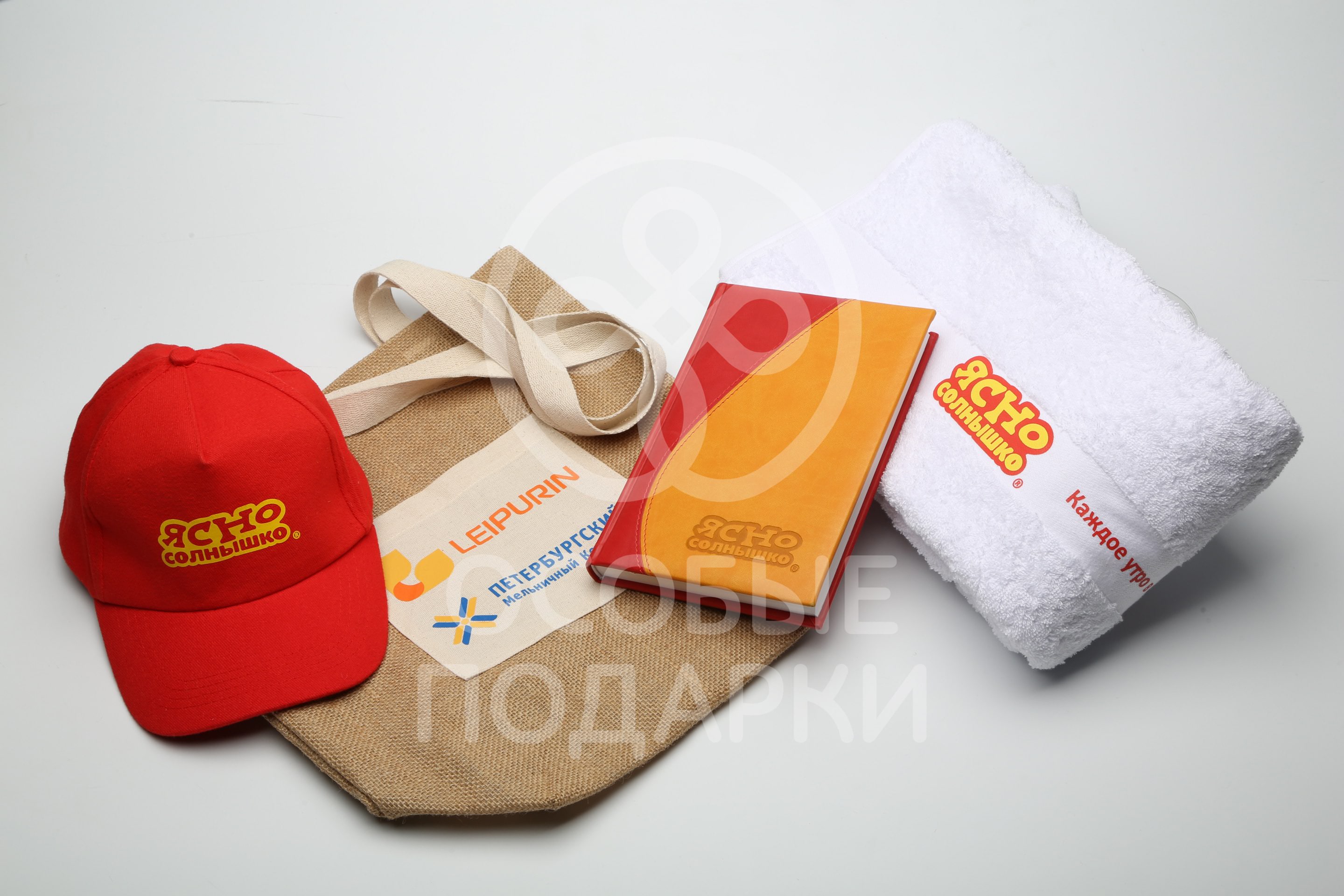 Для Петербургского мельничного комбината был выполнен заказ на эко-сумки для покупок, яркие ежедневники и кепки-козырьки и полотенца с лого бренда "Ясно-Солнышко".