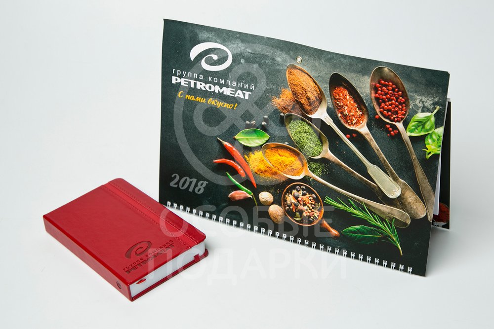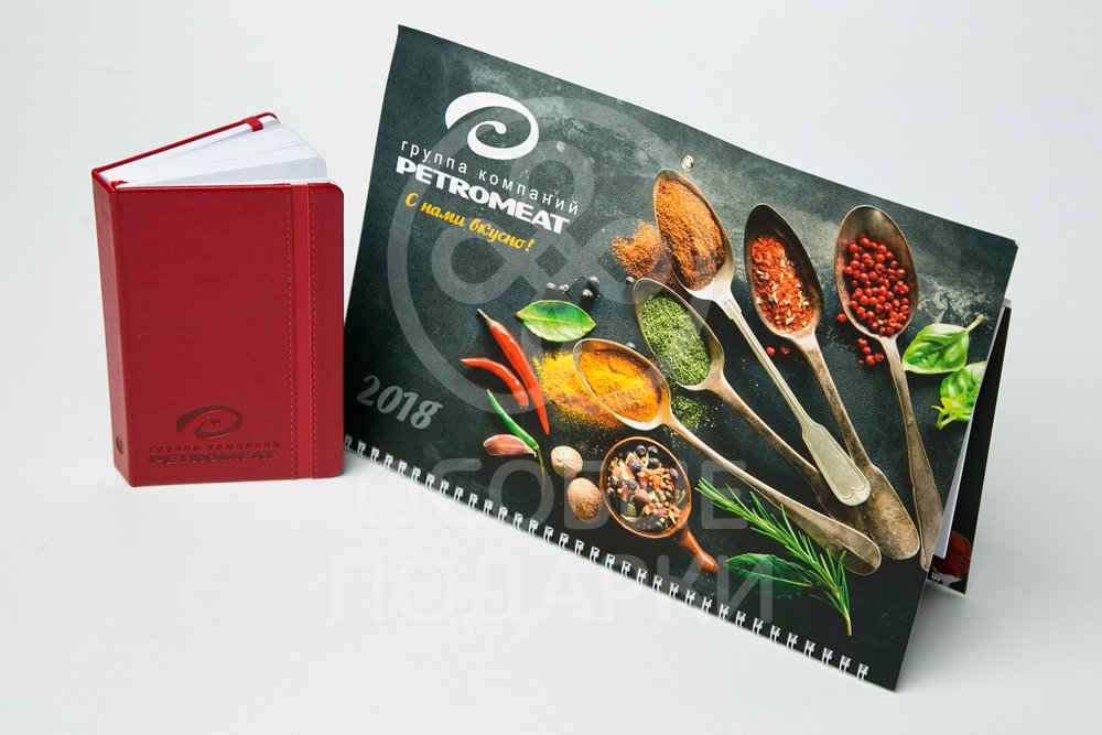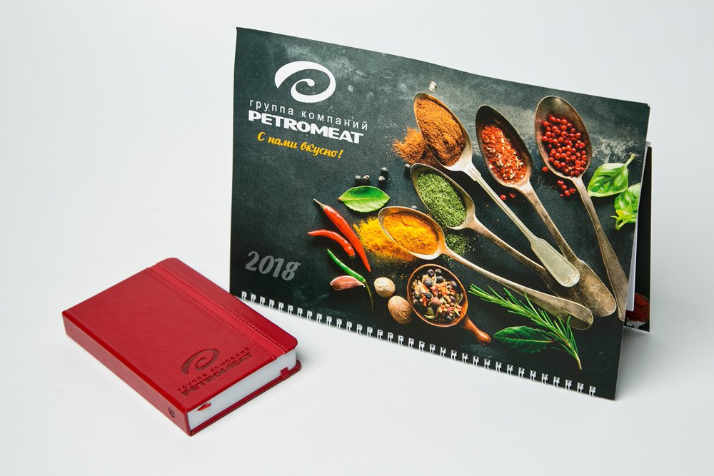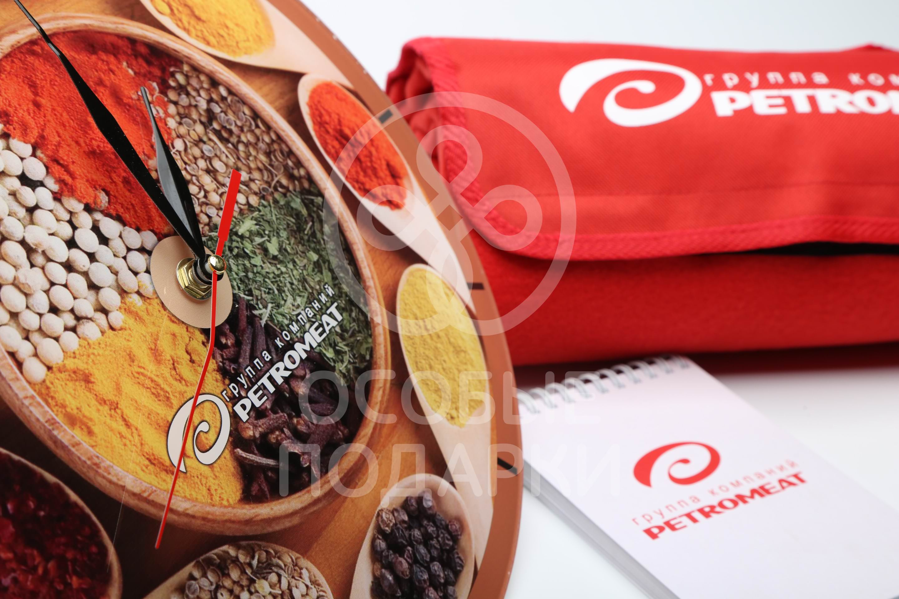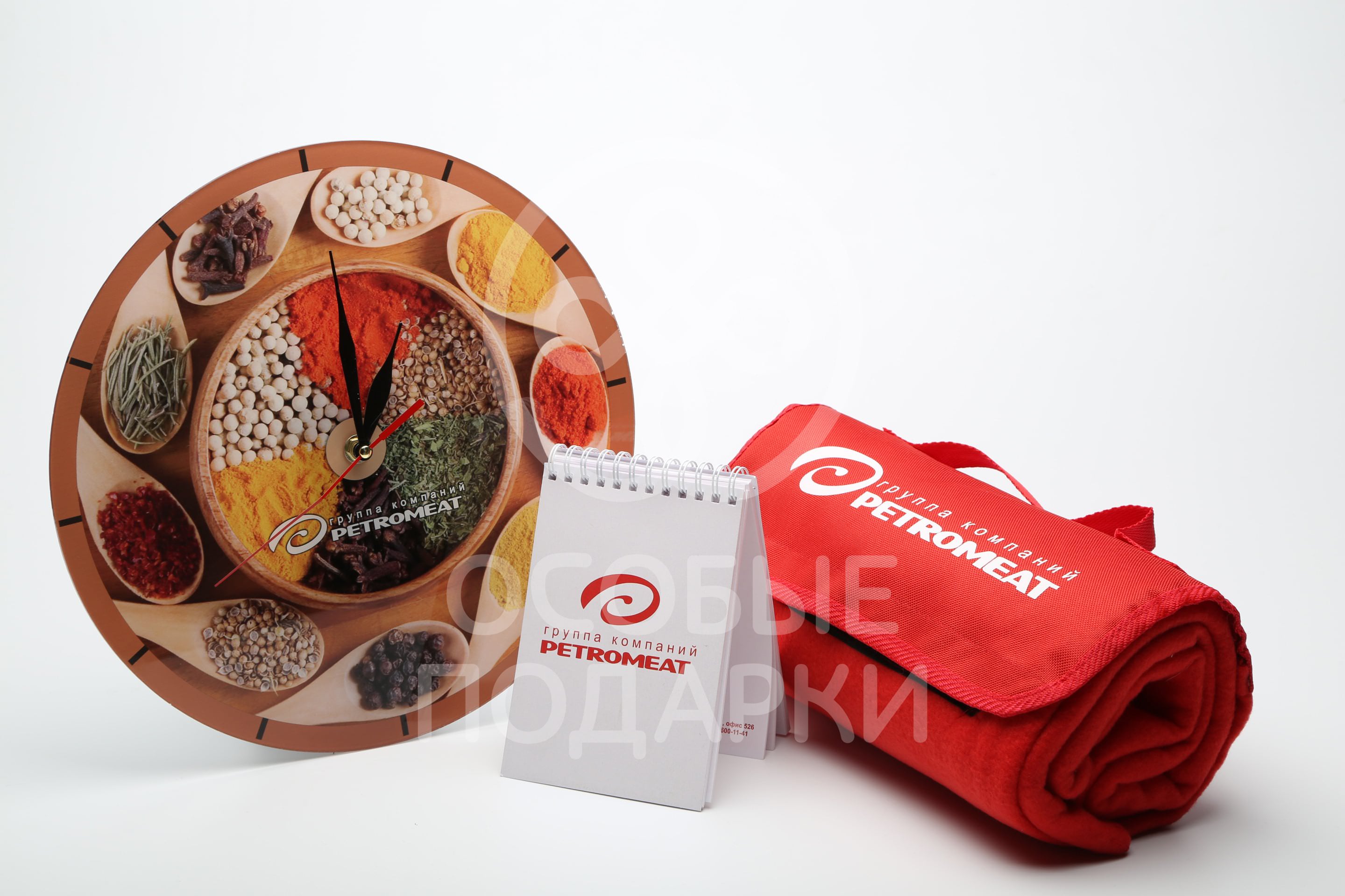 "Особые Подарки" разработала дизайн настенных часов для группы компаний Petromeat, а также нанесла шелкографию на уютные красные пледы и записные книжки.