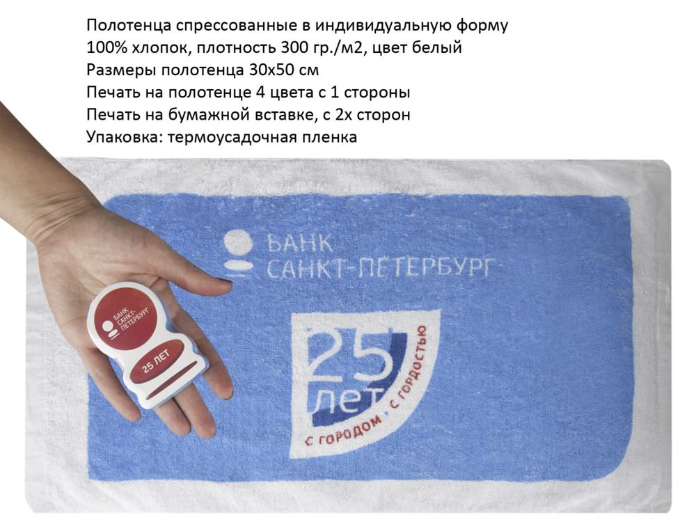 Полотенце — незаменимый предмет обихода, а спрессованной полотенце — это вещь еще и весьма удобная. Если взять его с собой в поездку, оно не займет много места в сумке или чемодане. Для рекламодателя предмет тоже весьма интересный, ведь благодаря пластичности хлопковое полотенце можно спрессовать в любую форму: от квадрата и овала до бутылки, елочки или даже машинки. Отличный подарок для промоакций.