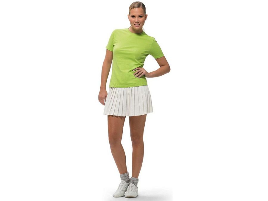 Женская футболка с короткими рукавами Ace. Модель стандартной посадки. Женская и детская модели - со швами по бокам. Резинка с эластаном и двойной строчкой на воротнике. Лента от плеча к плечу. Однослойная джерси, 100% хлопок. 150 г/м².