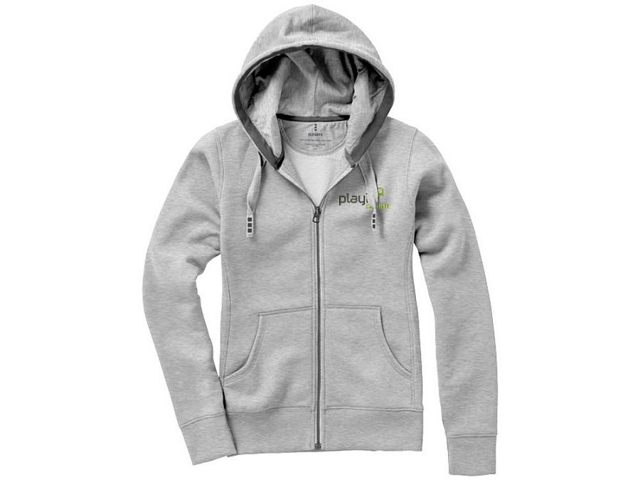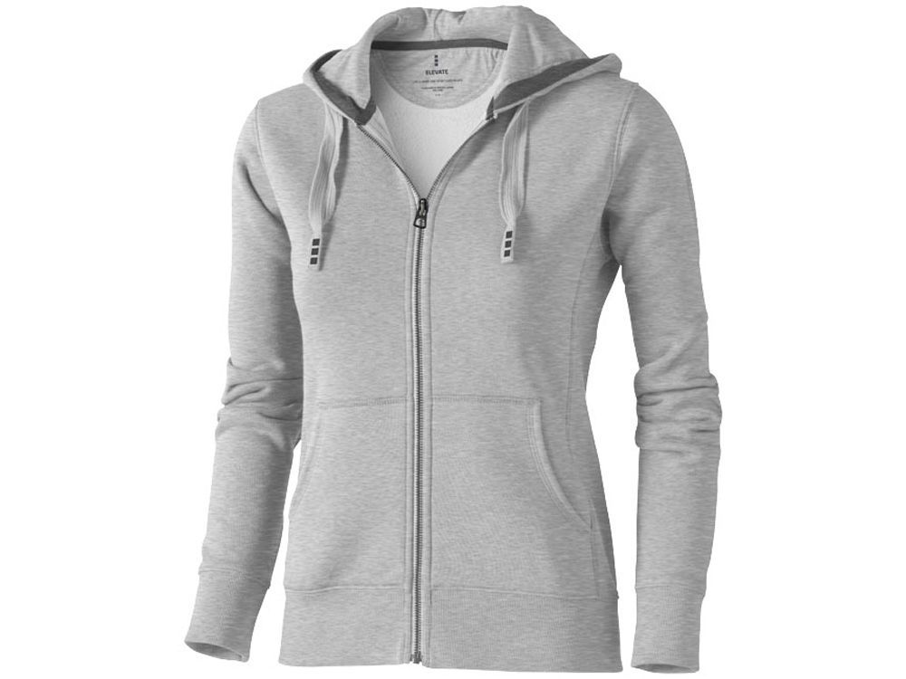Женский свитер Arora с капюшоном и застежкой-молнией на всю длину. Стандартный покрой. Резинка 2х2 на боковых вставках, поясе и манжетах. Карман кенгуру. Мужская и женская модели с завязками на капюшоне. Подкладка внутри капюшона. Атласная лента внутри горловины. Принт лого сзади в тон изделия. Серебристые люверсы с лого. Ворсистый внутри для мягкости, тепла и комфорта. Трикотаж: 80% хлопок и 20% полиэстер, чесаная внутренняя сторона. 300 г/м².