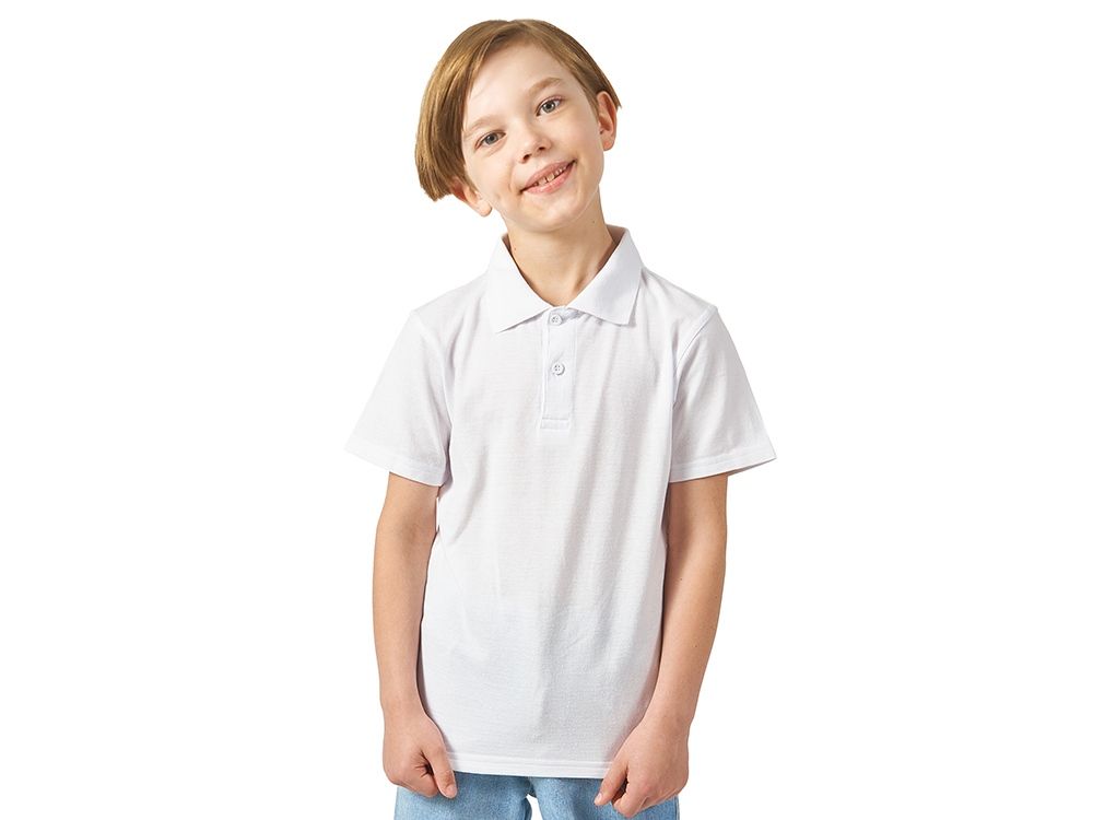 Детская рубашка поло First. Воротник 1х1. Обшивка внутри воротника. Мужская и детская модели с 2 пуговицами, женская - с 4 пуговицами. Пуговицы с гравировкой в тон. Пике, 100% хлопок. 160 г/м².