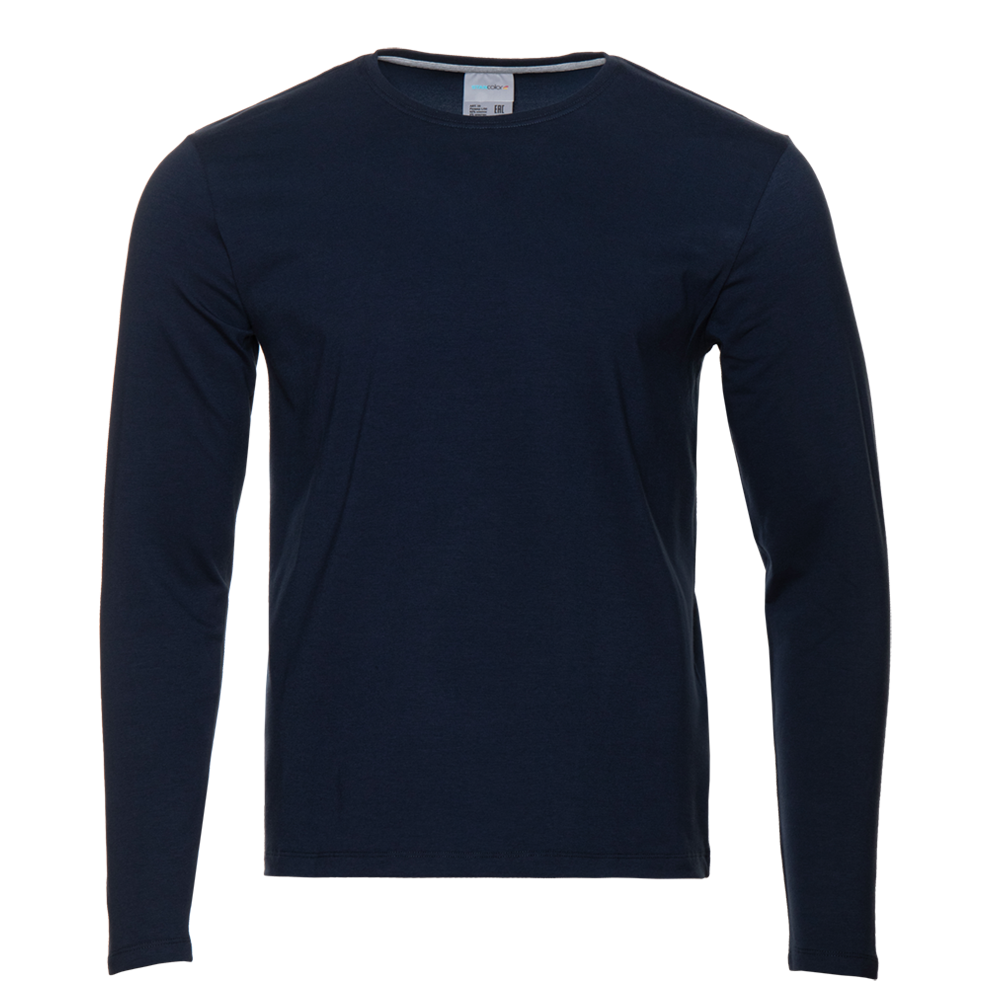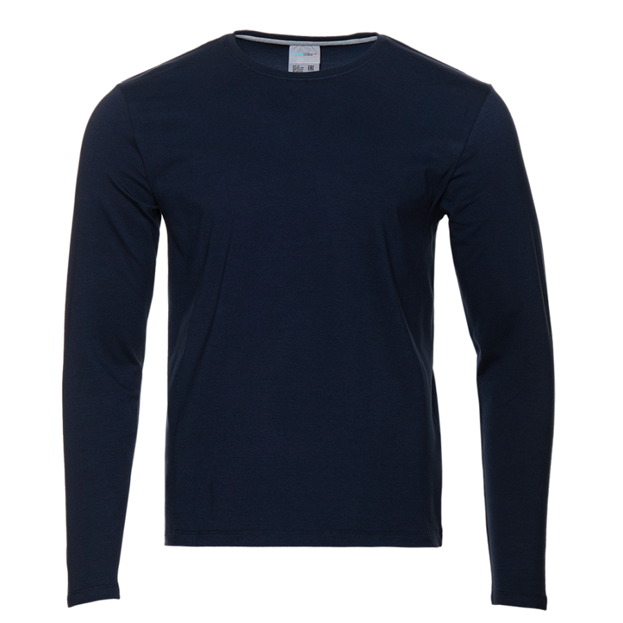 Универсальная футболка прямого силуэта с округлым воротом и длинным втачным рукавом. Плечевые швы и шов горловины усилены настрочной бейкой из основного полотна.