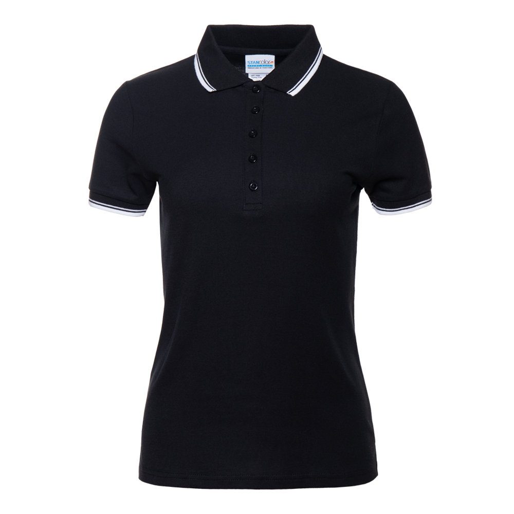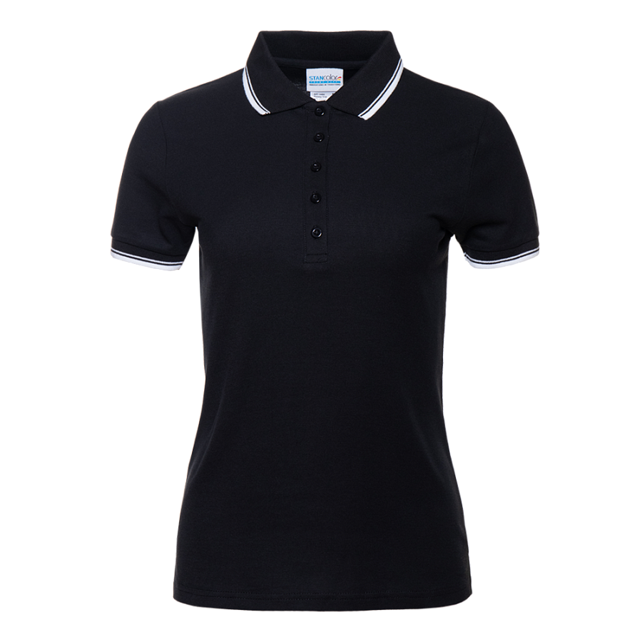 Женское поло приталенного силуэта с отложным воротником, втачным коротким рукавом и застежкой на пуговицы. Воротник и манжет выполнены контрастной резинкой.