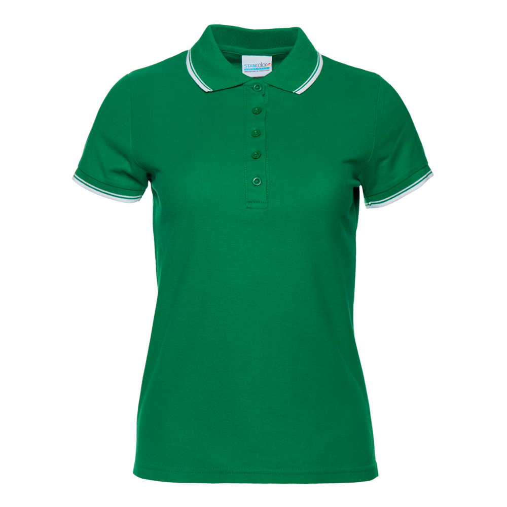 Женское поло приталенного силуэта с отложным воротником, втачным коротким рукавом и застежкой на пуговицы. Воротник и манжет выполнены контрастной резинкой.