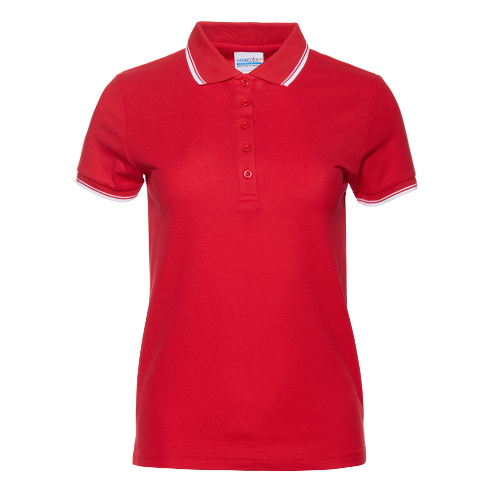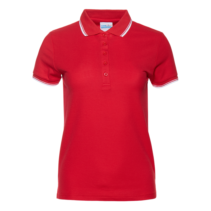 Женское поло приталенного силуэта с отложным воротником, втачным коротким рукавом и застежкой на пуговицы. Воротник и манжет выполнены контрастной резинкой.
