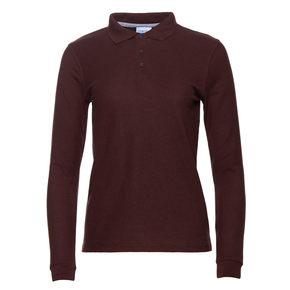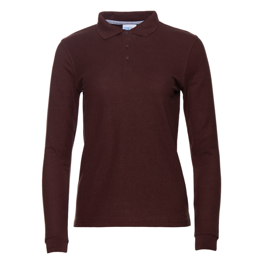 Женская рубашка поло приталенного силуэта с отложным воротником, длинным рукавом и застежкой на пуговицы.
