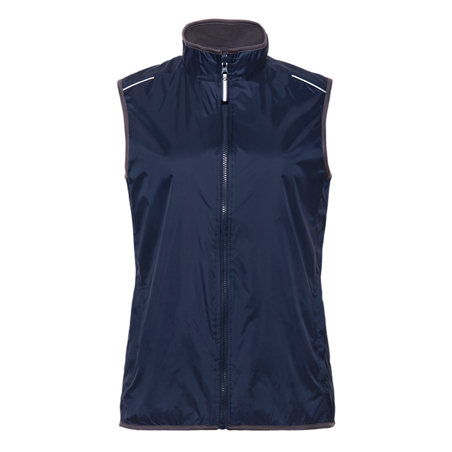 Женский жилет приталенного силуэта с воротником-стойкой, прорезным карманом и застежкой на молнию. Модель дополнена светоотражающими элементами на плечах, подвижной части застежки-молнии и по спинке изделия.