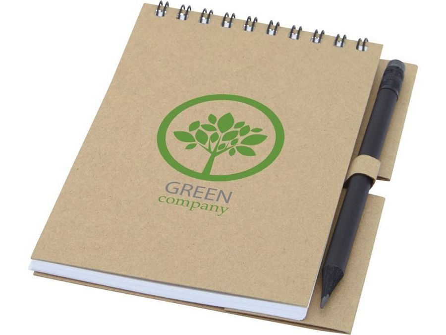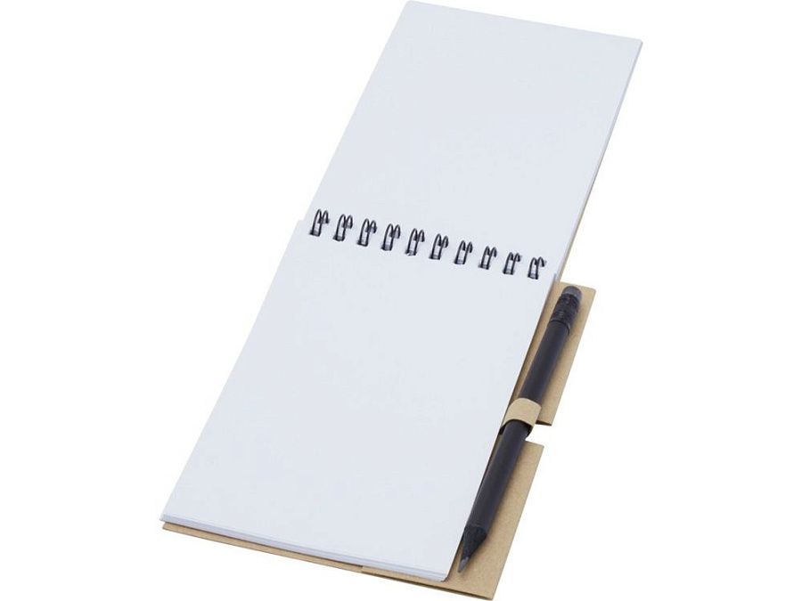Блокнот на гребне из 40 листов плотностью 80 г/м², обложка и листы изготовлены из переработанной бумаги, соответствующей FSC, без декора. В комплект входит черный карандаш. Блокнот изготовлен в Италии.