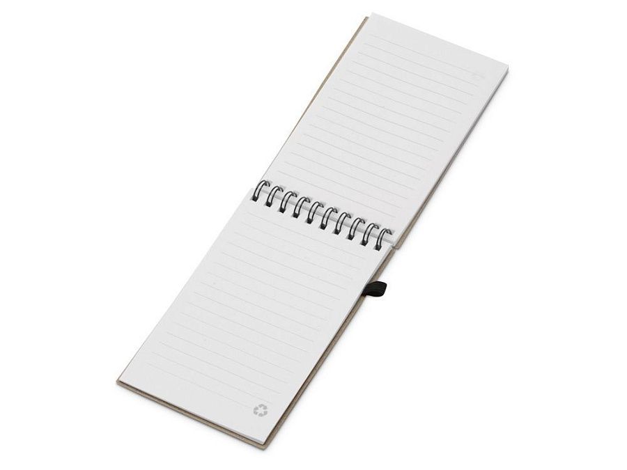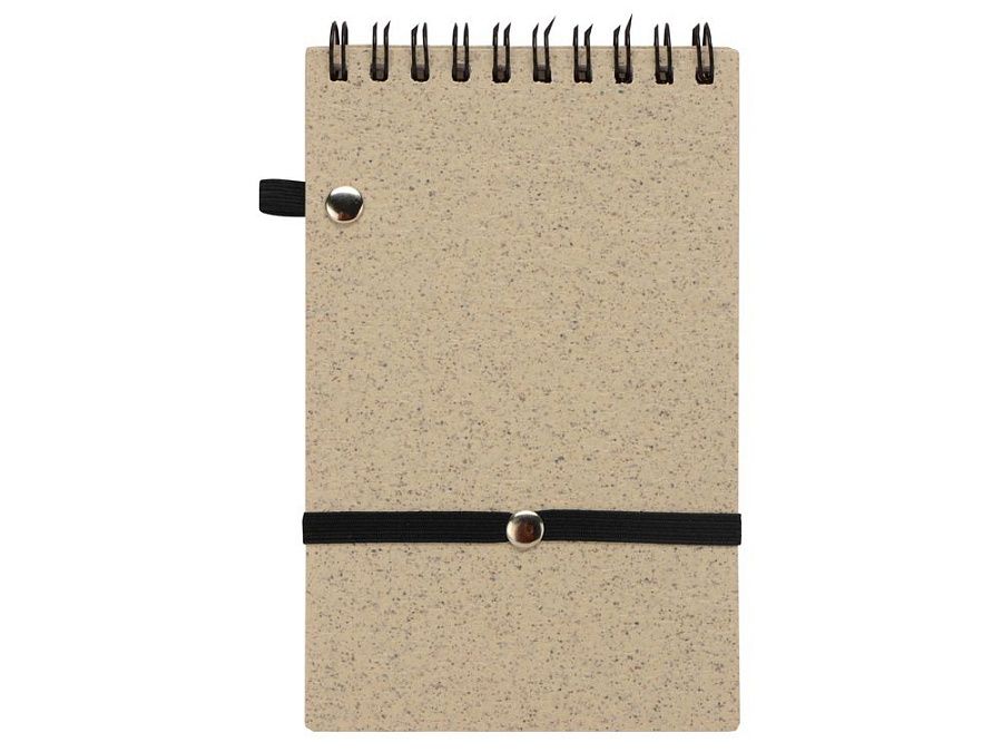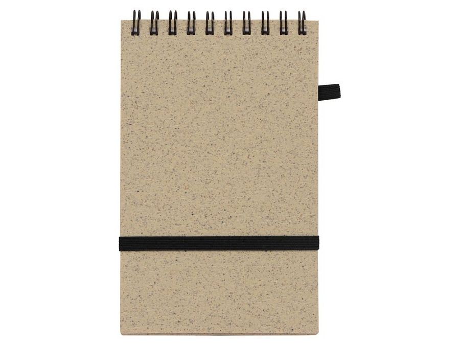 Блокнот с обложкой из переработанной пшеницы и пластика. Блок состоит из 60 листов переработанной бумаги белого цвета. Крепление - пружина. Дополнен петлей для ручки и горизонтальной резинкой.