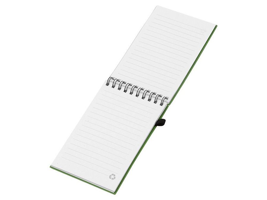 Блокнот с обложкой из переработанной пшеницы и пластика. Блок состоит из 60 листов переработанной бумаги белого цвета. Крепление - пружина. Дополнен петлей для ручки и горизонтальной резинкой.