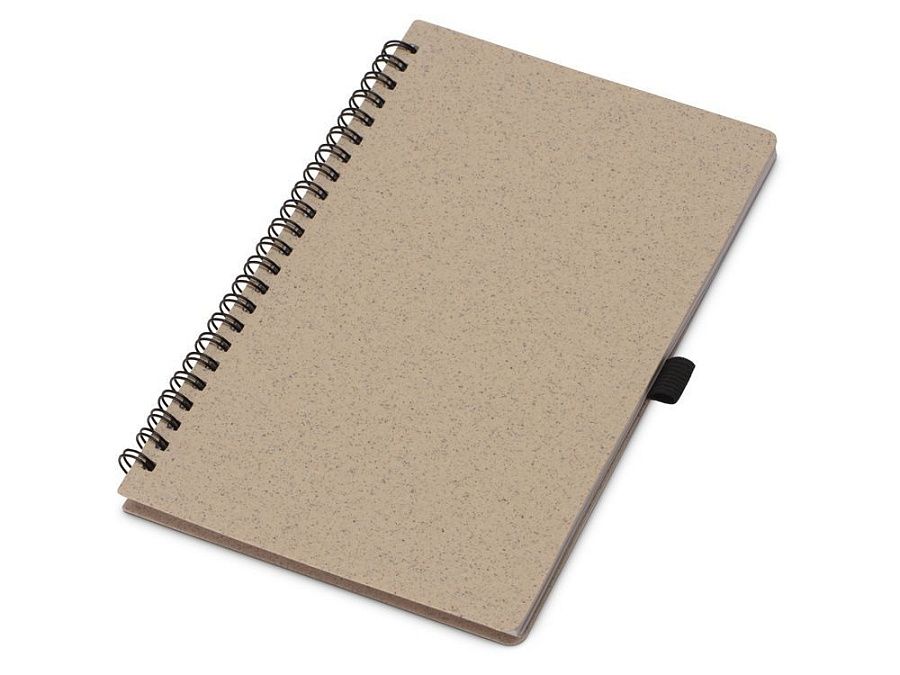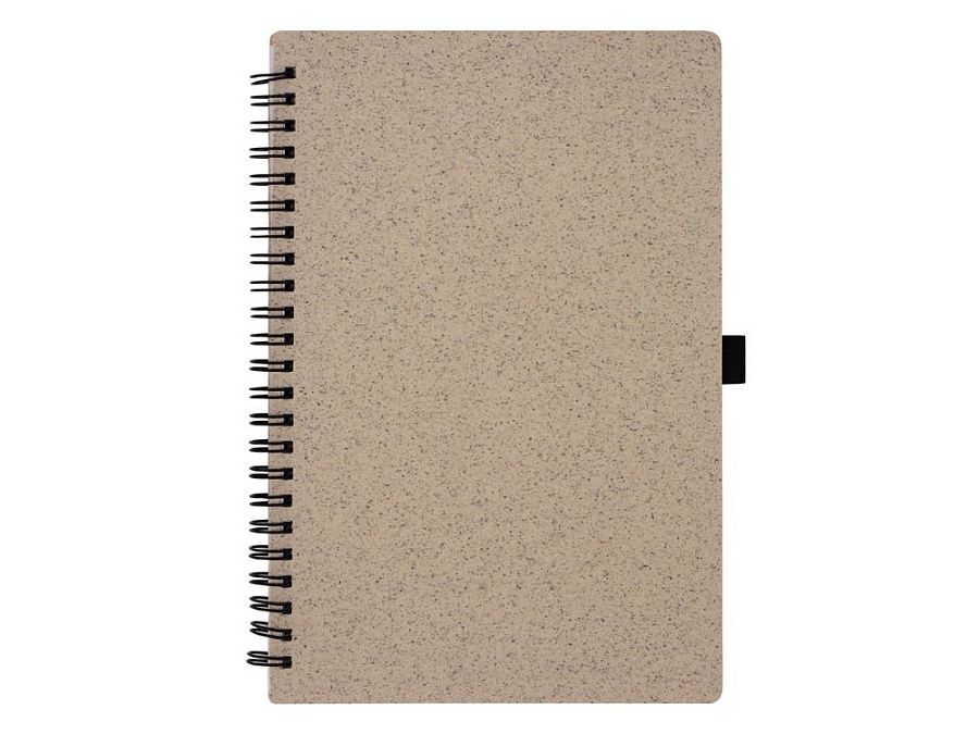 Блокнот с обложкой из переработанной пшеницы и пластика. Блок состоит из 60 листов переработанной бумаги белого цвета. Крепление - пружина. Дополнен петлей для ручки и горизонтальной резинкой.