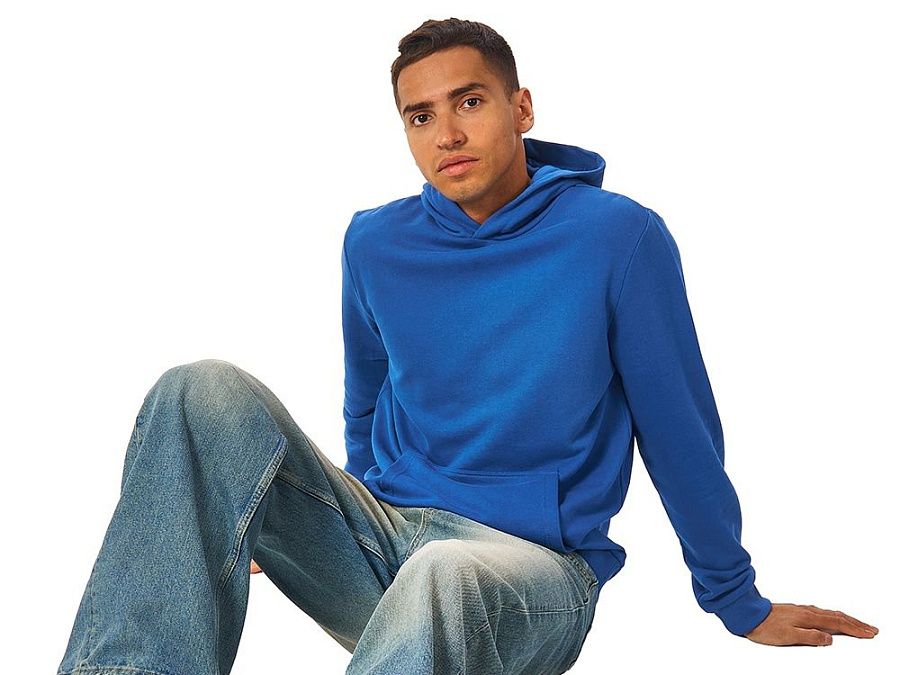 Толстовка с капюшоном (худи) из плотного хлопкового 3х ниточного футера. В капюшоне подкладка в тон, а горловина спинки дополнительно укреплена тесьмой с выделкой «елочка». Капюшон без шнурков – ничего не отвлекает от вашего брендирования. Манжеты и низ изделия отделаны рибом 2х2. Глубокий комфортный карман кенгуру на полочке. Полотно из утяжеленного хлопкового футера внутри с петельками без начеса.