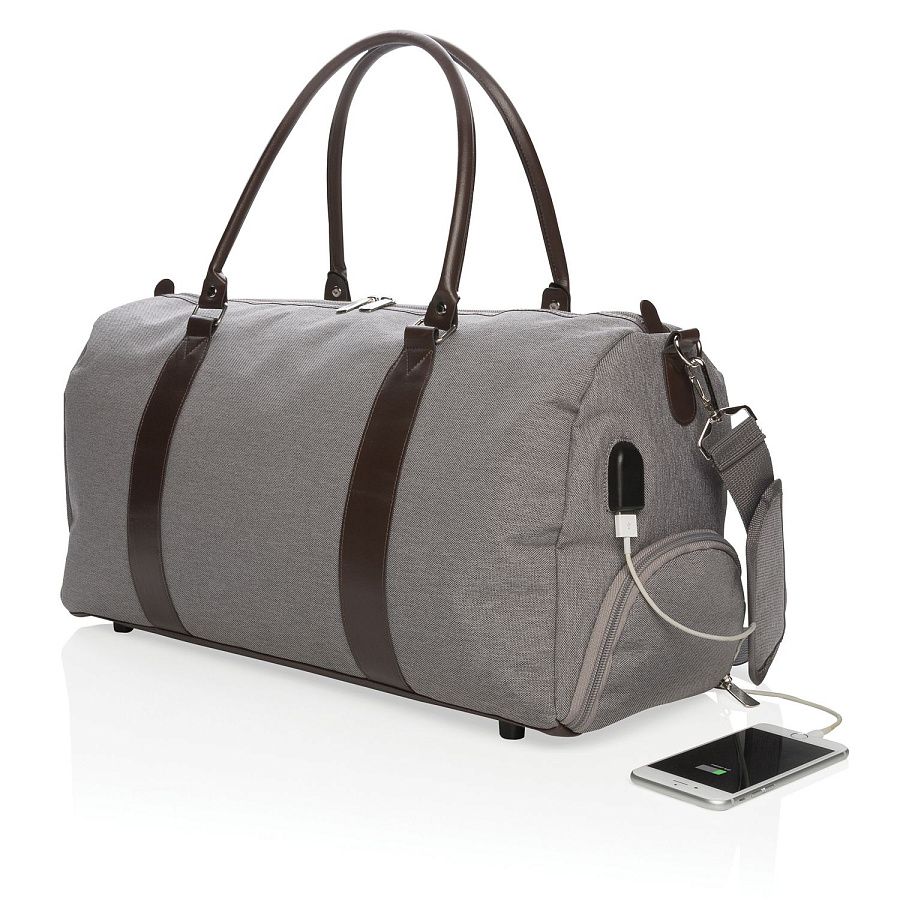 Сумка со встроенным USB - портом выполнена в лаконичном минималистическом дизайне из полиэстера 600D. Ручки и стильные элементы на сумке изготовлены из полиуретана, также на сумке предусмотрен удобный плечевой ремень. Во вместительном основном отделении найдется место для всего, что может пригодиться в поездке или на спортивной тренировке. Подключите телефон к интегрированному USB-порту на боковой части сумки, и вы сможете заряжать свои мобильные устройства на ходу. Небольшой наружный карман отлично подойдет для всех важных мелочей, которые всегда должны быть под рукой. Не содержит ПВХ.