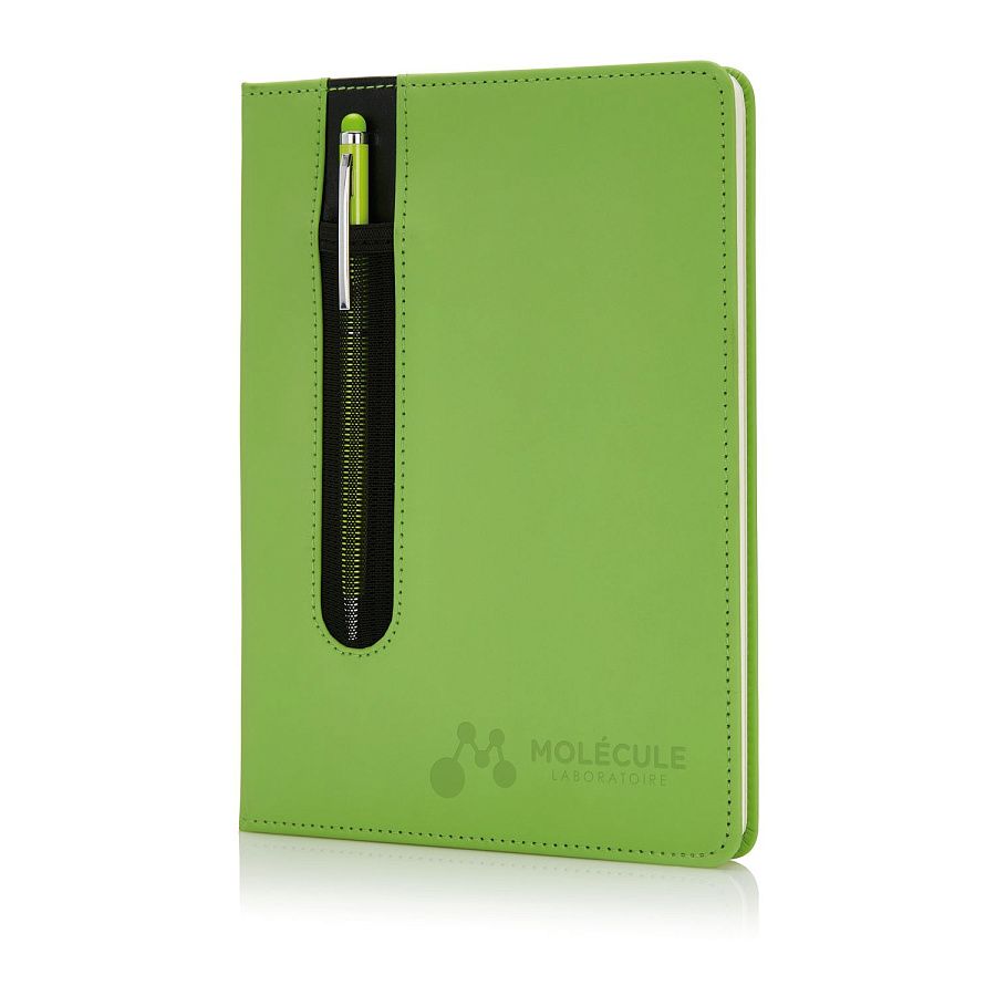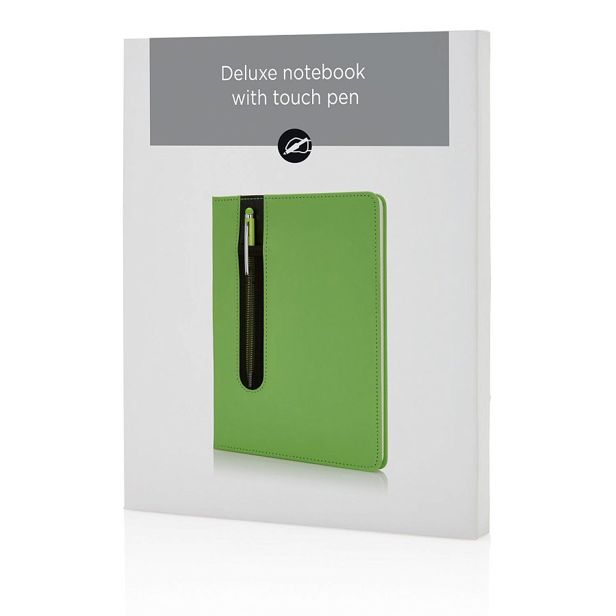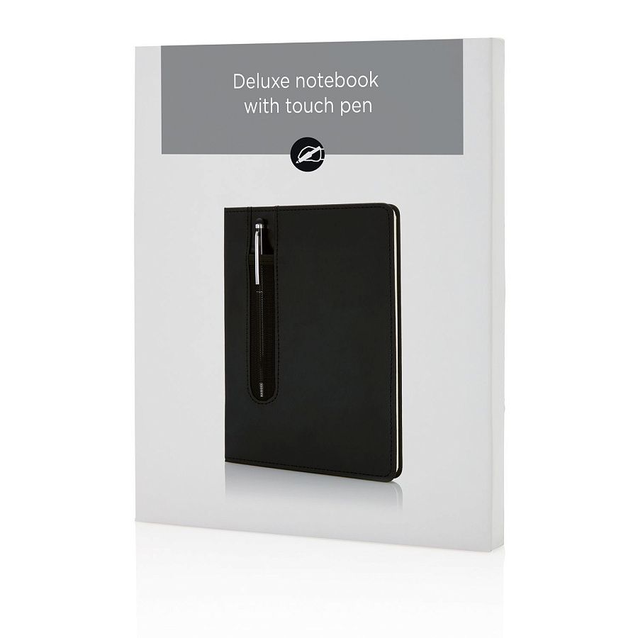 Блокнот для записей Deluxe формата A5 с кармашком для ручки и ручкой-стилус в комплекте. Упакован в подарочную коробку. Блок формата А5 на 80 страниц, плотность бумаги 80 г/м2.