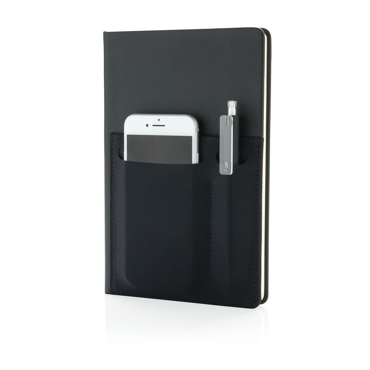 В блокноте Deluxe формата A5 80 кремовых листов плотностью 80г/м2. На нем предусмотрены универсальные карманы для телефона, ручек и документов, изготовленные из плотной, хорошо тянущейся ткани. Размер кармана для телефона составляет 8 см, а значит, iPhone 7+ и смартфоны похожих размеров отлично поместятся.