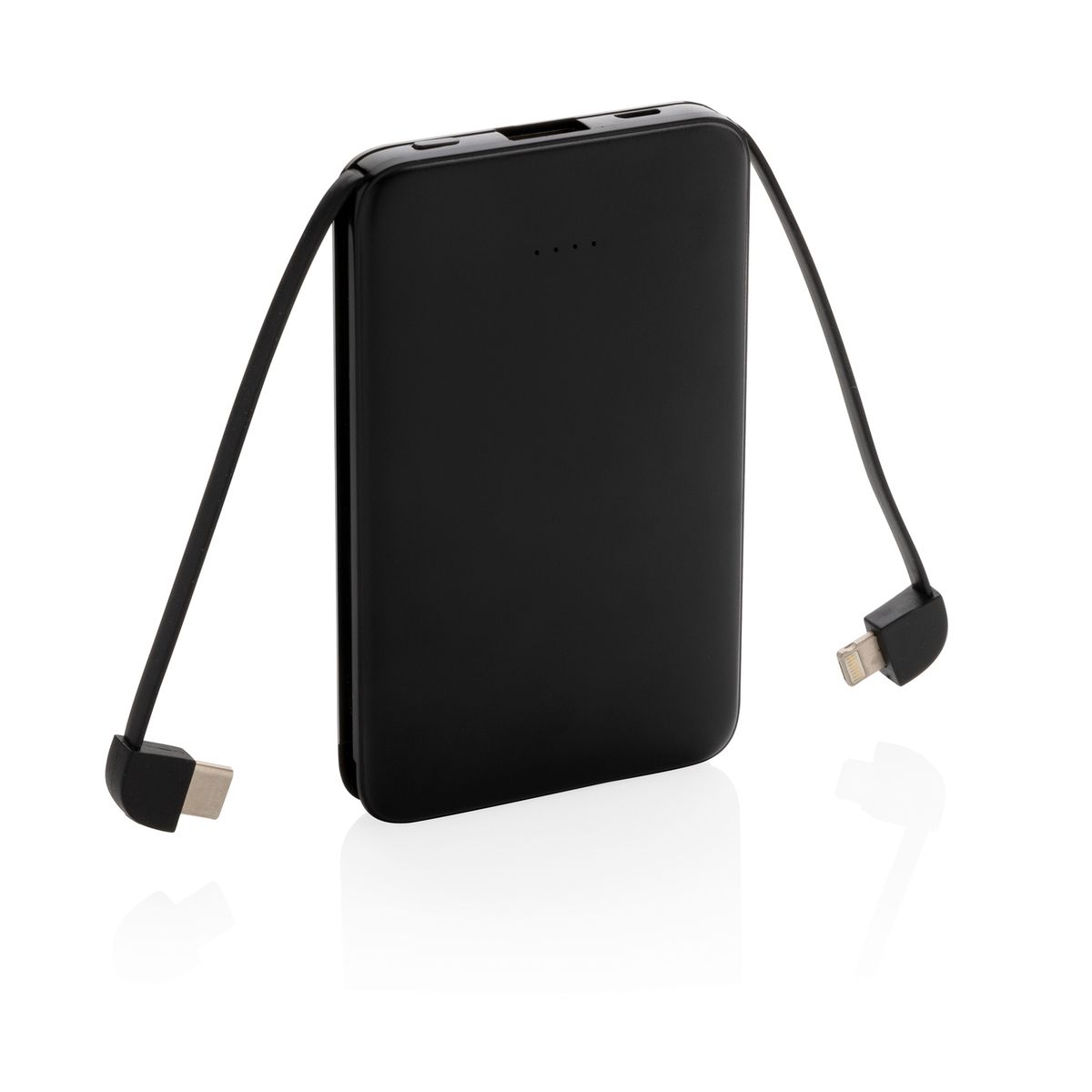 Этот компактный пауэрбанк с приятным на ощупь матовым корпусом из ABS легко носить с собой. Емкость аккумулятора составляет 5000 мАч. В корпус устройства встроены TPE кабели с разъемом Type C и комбинированным разъемом для устройств на платформе iOS и на платформе Android (micro USB). Энергии полностью заряженного литий-полимерного аккумулятора высокой плотности хватит, чтобы зарядить ваш смартфон до двух раз. Удобные световые индикаторы отображают уровень заряда, напоминая о необходимости подзарядить устройство. Напряжение на входе и на выходе: 5V/2A.