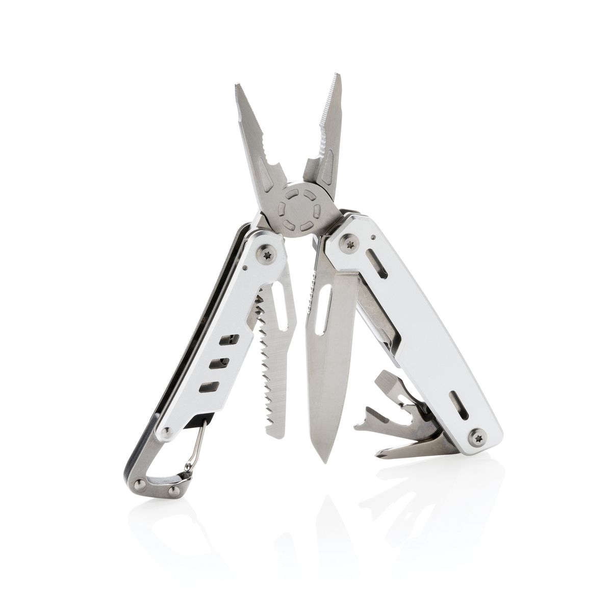 Надежный и долговечный мультитул с 11 функциями. Корпус выполнен из алюминия, а инструменты — из нержавеющей стали. В мультитуле предусмотрены: узкогубцы, плоскогубцы, кусачки, нож, крестообразная отвертка Phillips, стриппер, открывалка для бутылок, плоская отвертка, консервный нож, пила и карабин для крепления. Поставляется в фирменной коробке.
