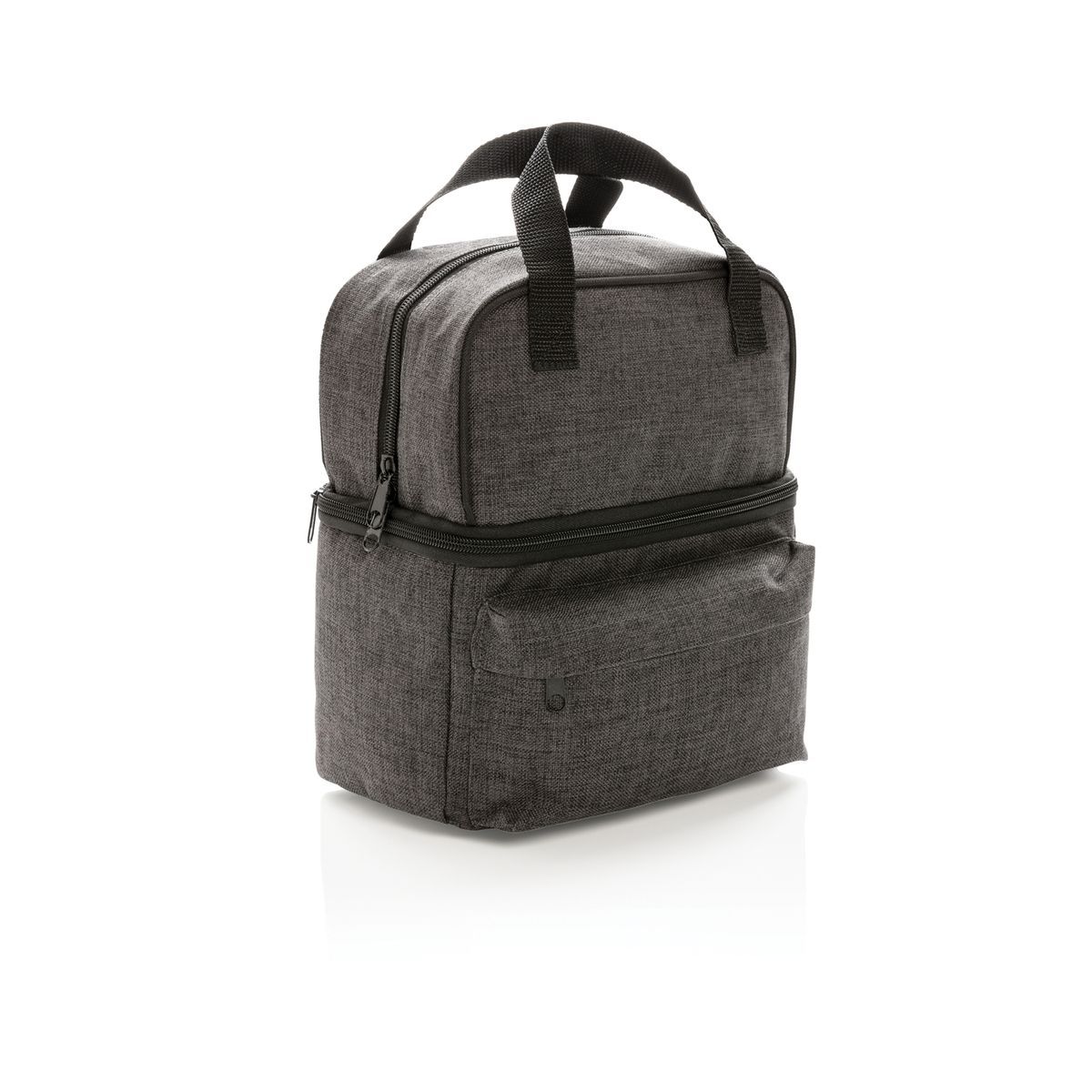 Сумка-холодильник из прочного полиэстера плотностью 600D с удобными ручками для переноски и изолированными отделениями. Просторное верхнее отделение отлично подходит для фруктов, закусок или печенья. В нижнем отделении квадратной формы можно разместить до 6 банок. Передний карман на молнии идеально подходит для небольших аксессуаров, например, для ключей.