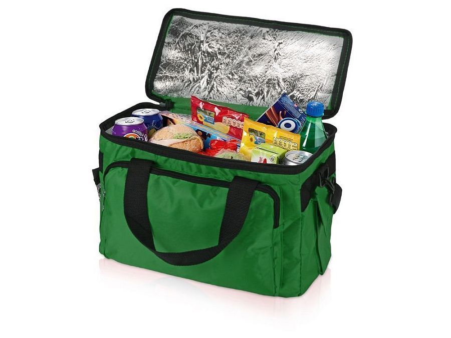 Вместительная сумка-холодильник (объем – 15 л.) «Камайоре» прекрасно подойдет не только для индивидуальных пикников, но даже и для доставки горячих продуктов (пиццы, например). С боков 2 кармана – один сетчатый с регулируемой затяжкой для бутылки. Другой для приборов, салфеток или других мелочей закрывается на липучку. Наружный слой сделан из полиэстера, на него может быть нанесена персонализация: имя владельца или логотип компании.