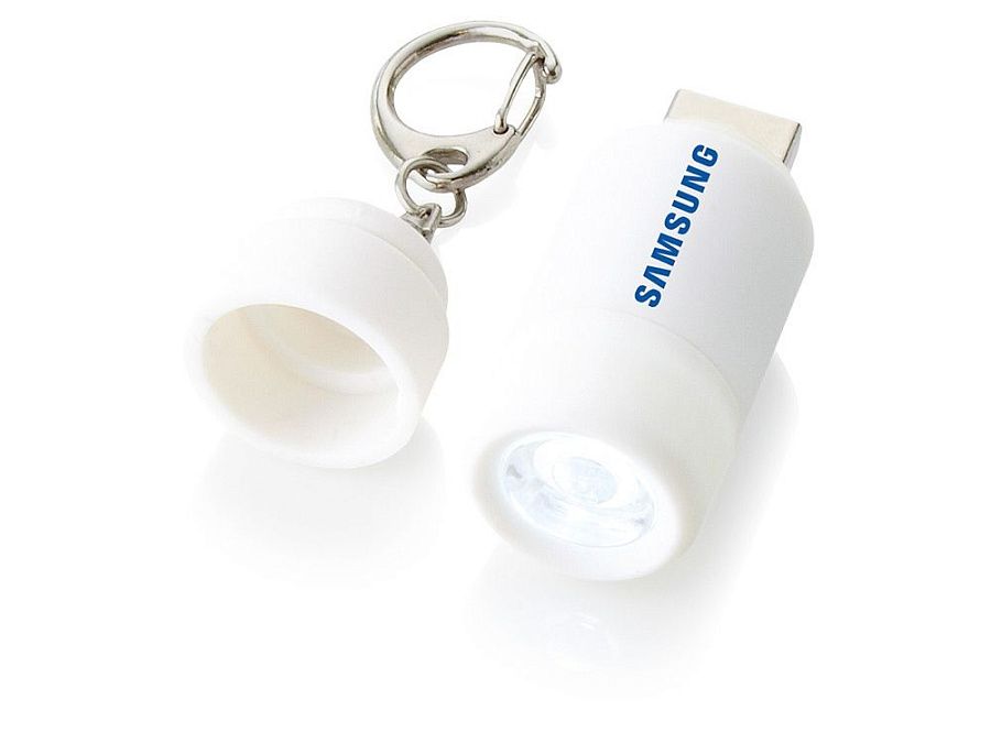 Брелок-фонарь Avior с зарядкой от USB. Светодиодный фонарик с зарядкой от USB с поворотной кнопкой вкл/выкл и металлическим кольцом для ключей. Батарейка включена в комплект. АБС-пластик с мягким на ощупь покрытием.
