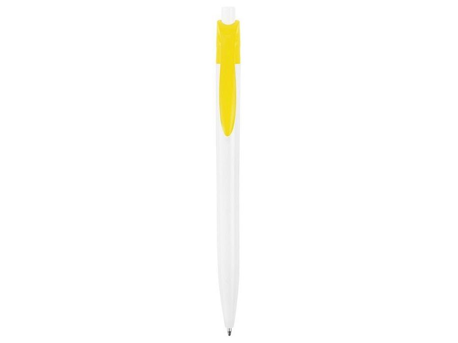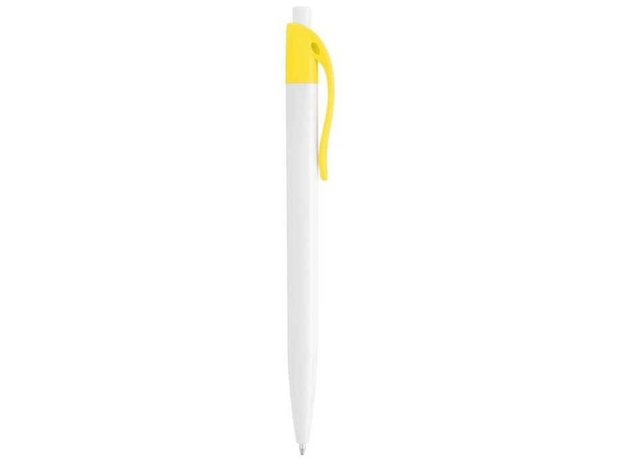 Стильная пластиковая ручка с ярким цветным клипом и белым корпусом отлично подойдет для нанесения логотипов и рекламной информации. Нажимной механизм.