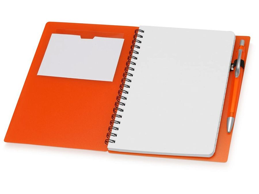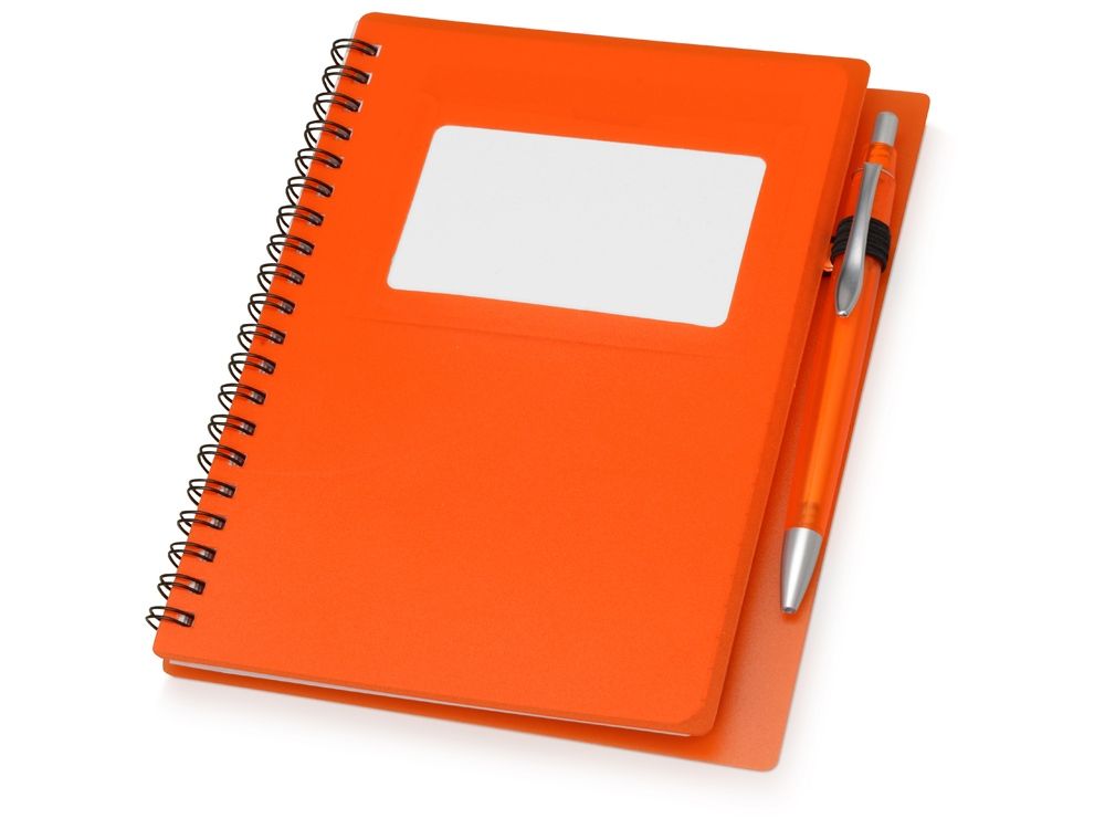 Блокнот «Контакт» в полипропиленовой обложке переплетен на пружине. В обложке блокнота предусмотрено окошко, в которое можно поместить визитную карточку или полиграфическую вставку. В комплекте с блокнотом идет ручка, которая вставляется в петельку сбоку.