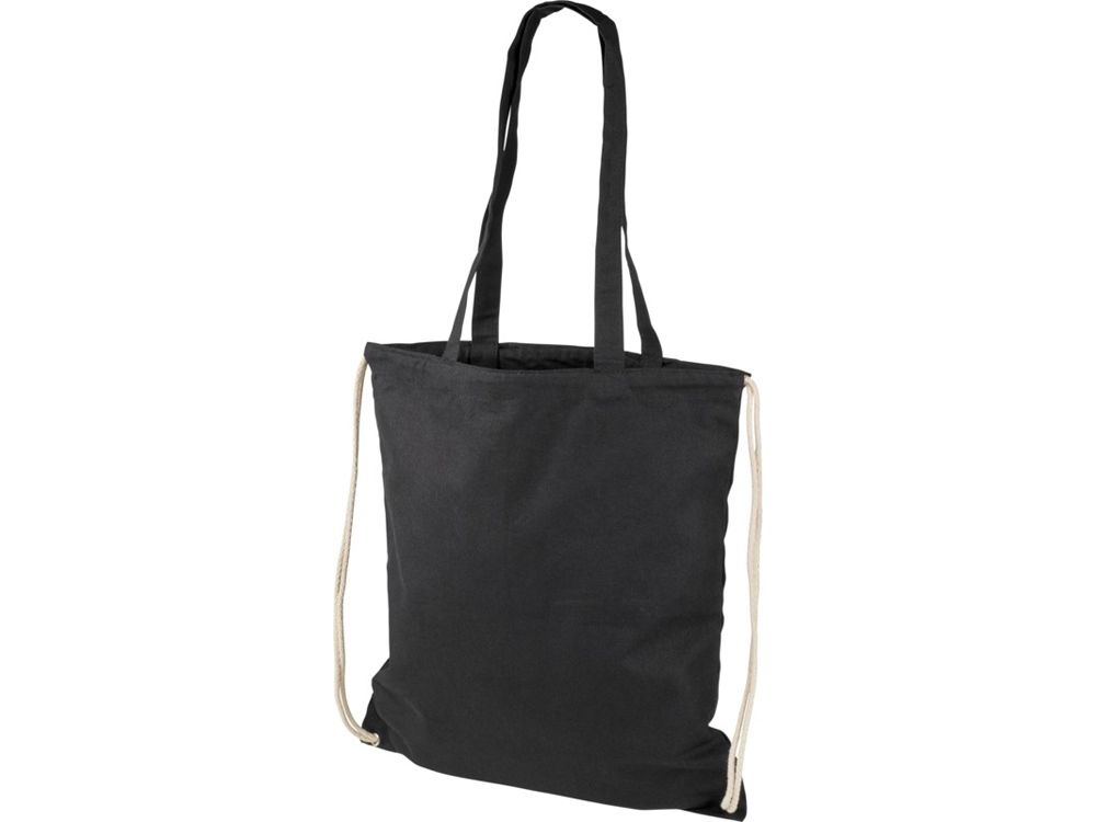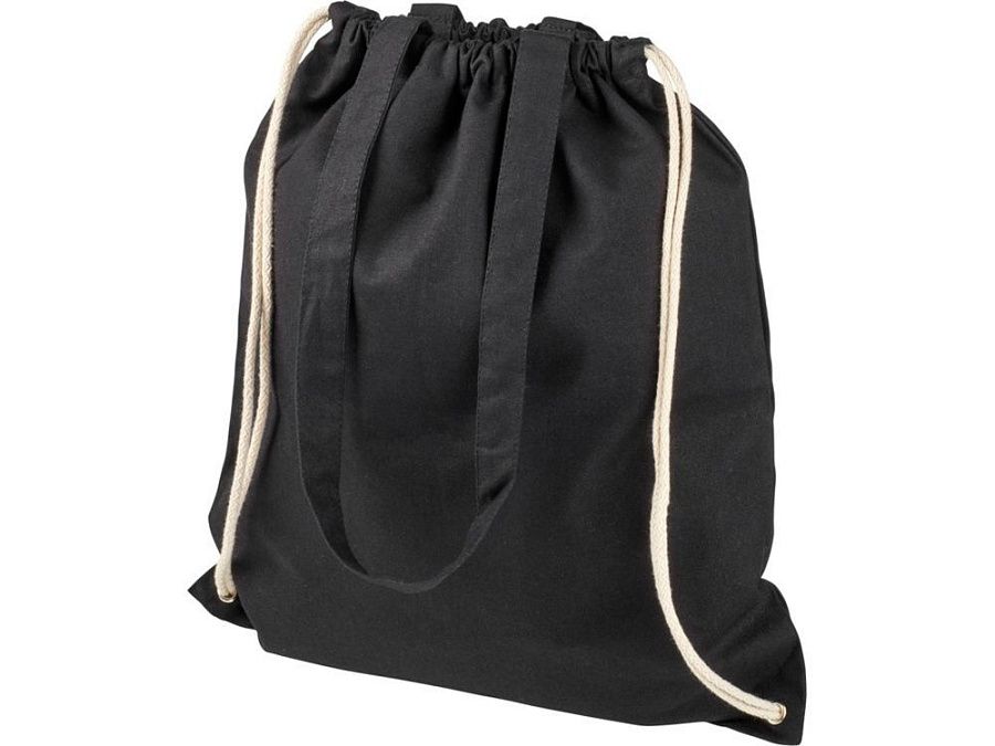 Многофункциональный хлопчатобумажный мешок с длинными ручками и затягивающим шнурком, который можно носить в качестве сумки для покупок или рюкзака. Большой основной отсек, закрывающийся затяжкой шнурка. Имеет две выпадающие ручки длиной 31 см. Вместимость: 16 л, выдерживает до 5 кг веса. Хлопок, 240 g/m2.